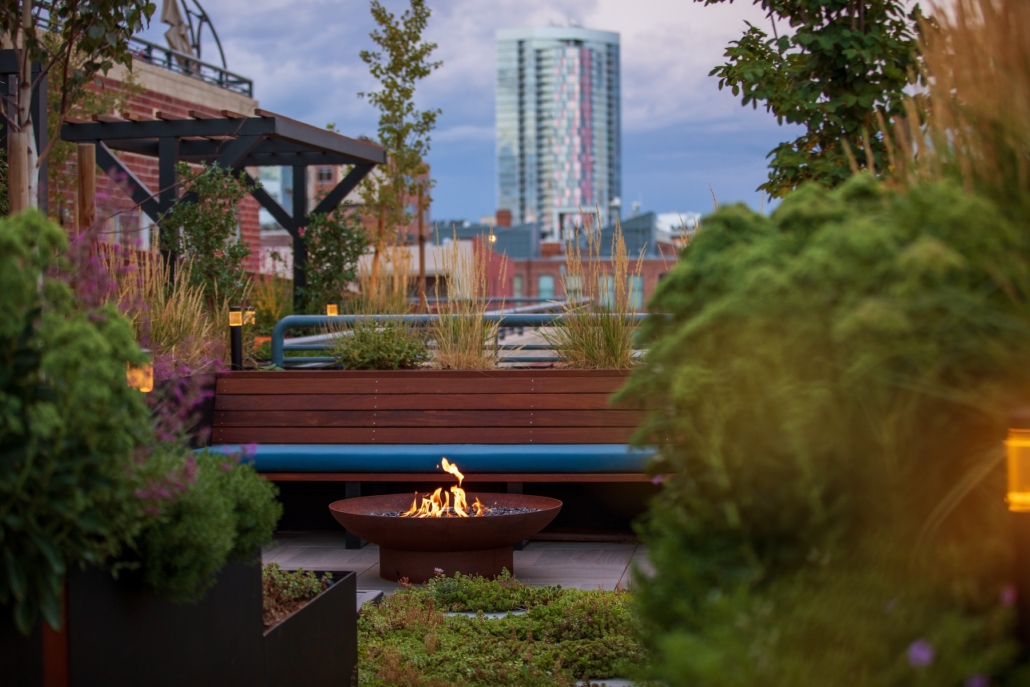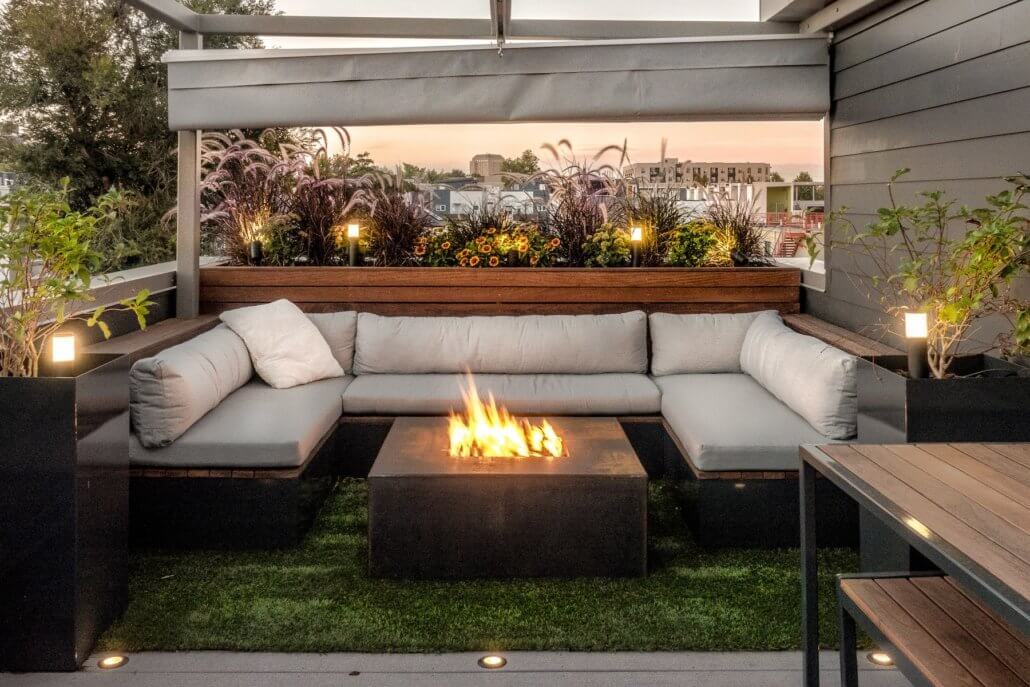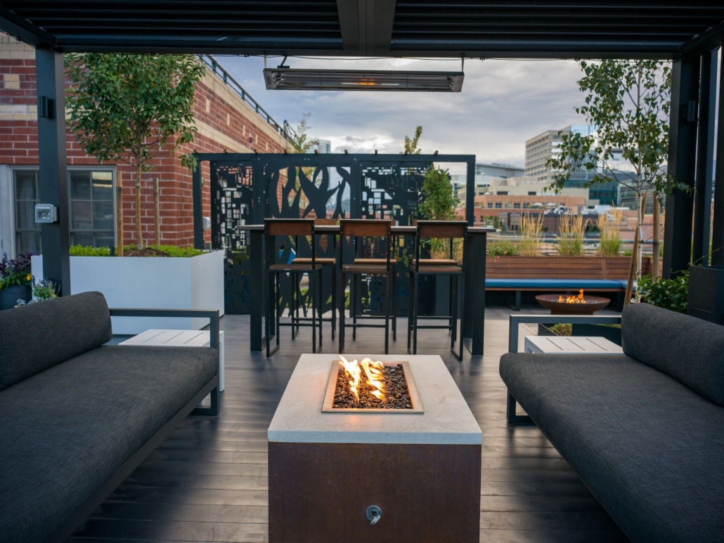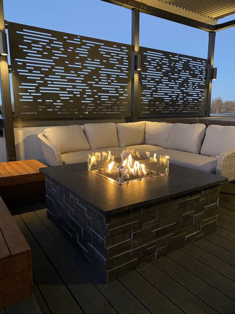 Create a beautiful and inviting space for yourself, your friends and your family on your transformed rooftop deck with a warming fire feature. Choose from our locally made fire pits or have us design a custom fire feature with various size, shape, and color options. Whether you want a statement fire place or a wallflower, your fire feature will be the star of the show when cooler temps meet that bright orange flame.